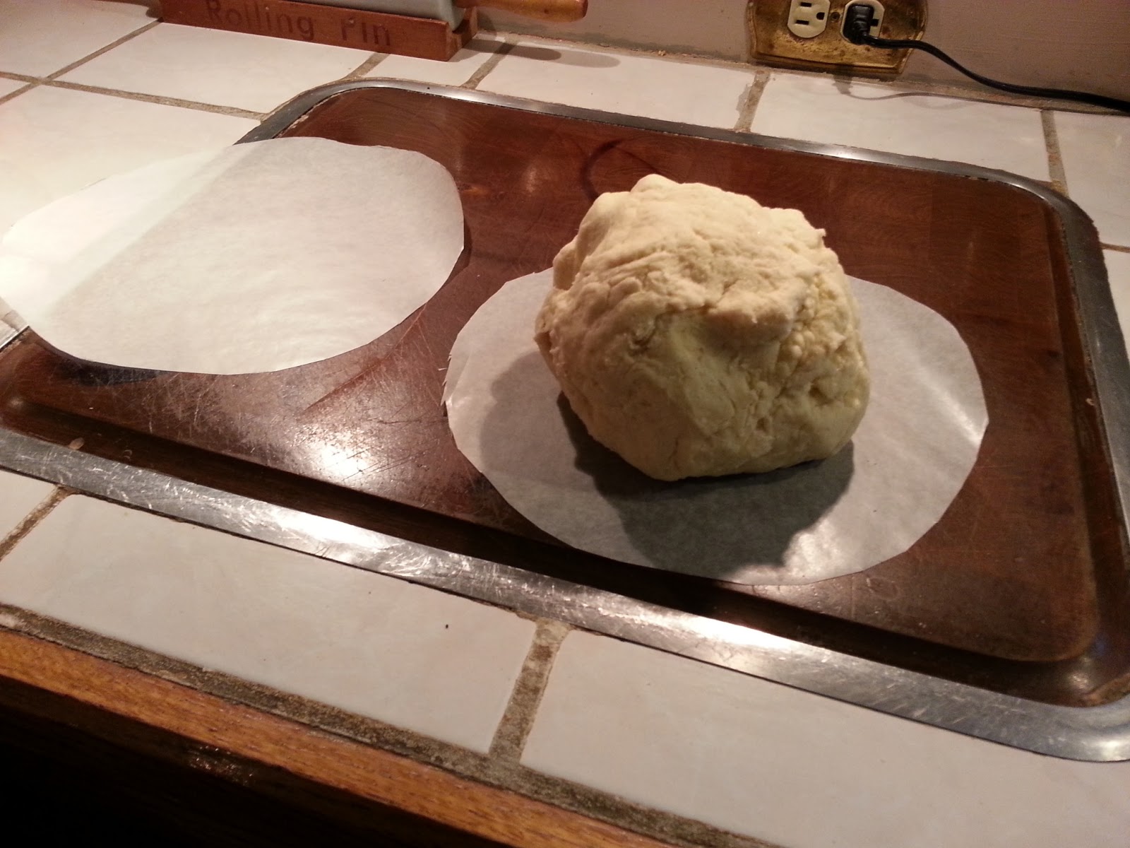 5. Place the dough onto one of the 10 inch wax paper circles and press out dough to the edges.